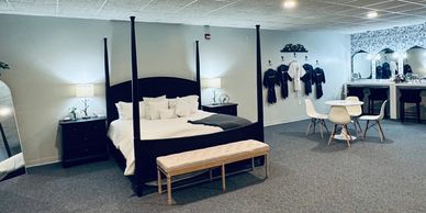 King Suite for the Bride and Groom features King 4 Poster Bed, living area with smart tv, fully tiled large walk in shower, seating area, and hair and make up stations for the bridal party!
