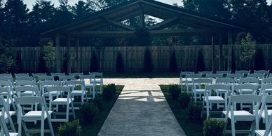 Outdoor Garden Ceremony Space with chairs for 100 and Large Custom Built Arbor.